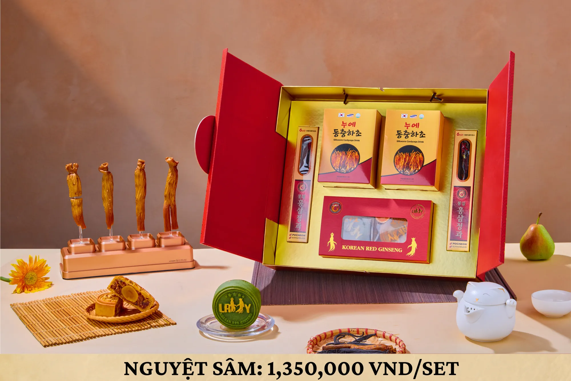 Nguyệt Sâm kết hợp đông trùng hạ thảo – hồng sâm – bánh trung thu, tạo nên món quà vừa tinh tế, vừa chăm sóc sức khỏe. Thiết kế sang trọng, chỉn chu, thích hợp để biếu tặng đối tác, tri ân khách hàng hay gửi gắm yêu thương đến gia đình, bạn bè.